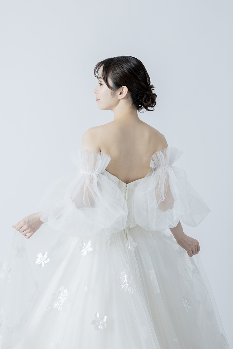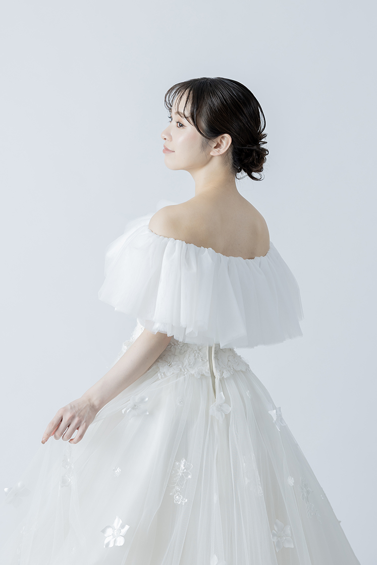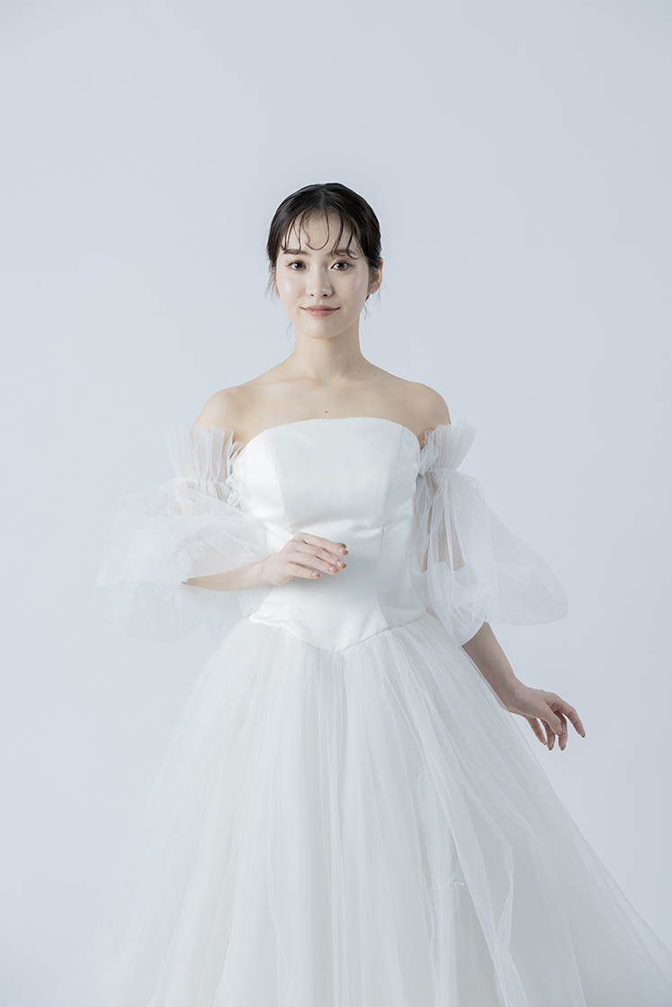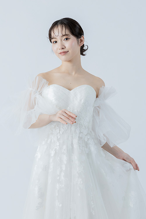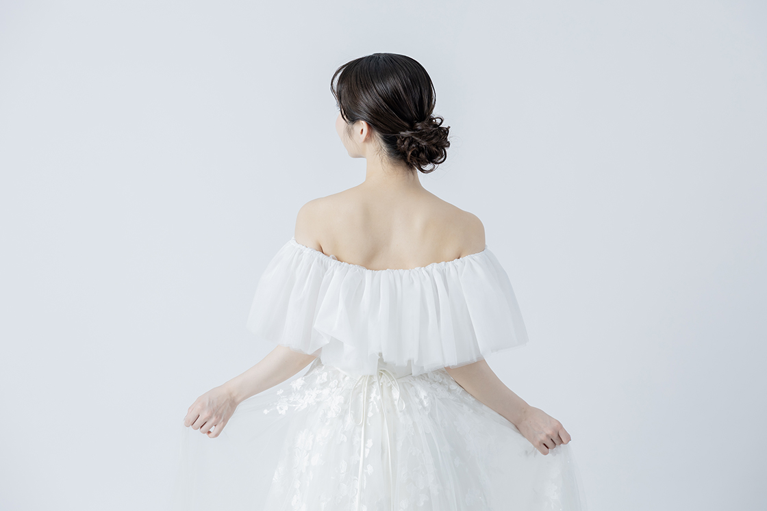 チュールが二の腕や背中をさりげなくカバーしてくれるため、露出を控えめにしたい方にもおすすめです。