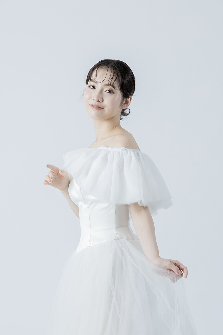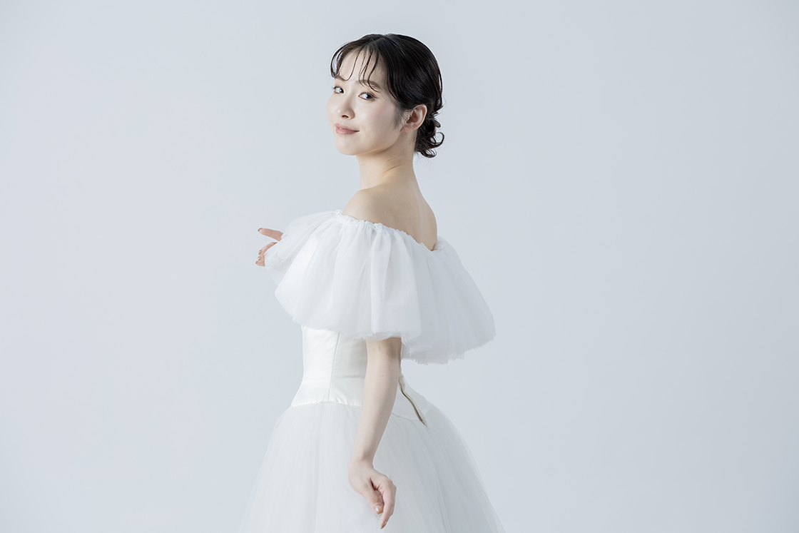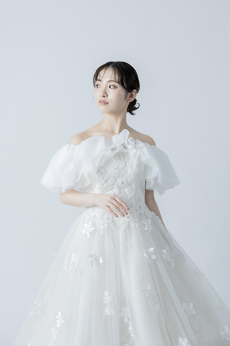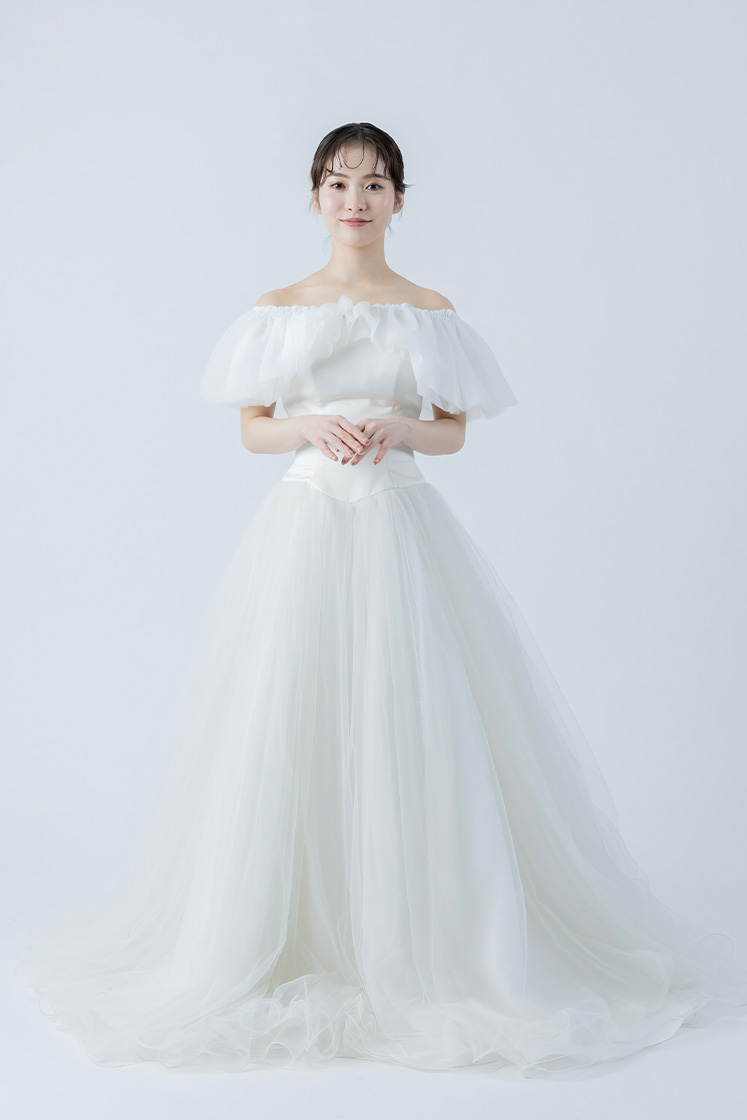 肩まわりを美しく見せるオフショルダーのラインと、