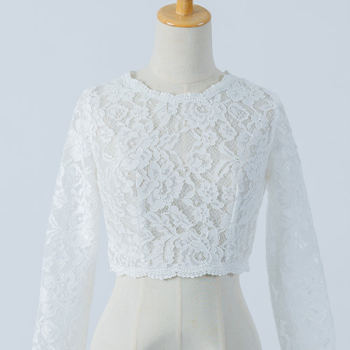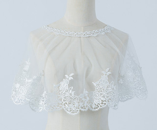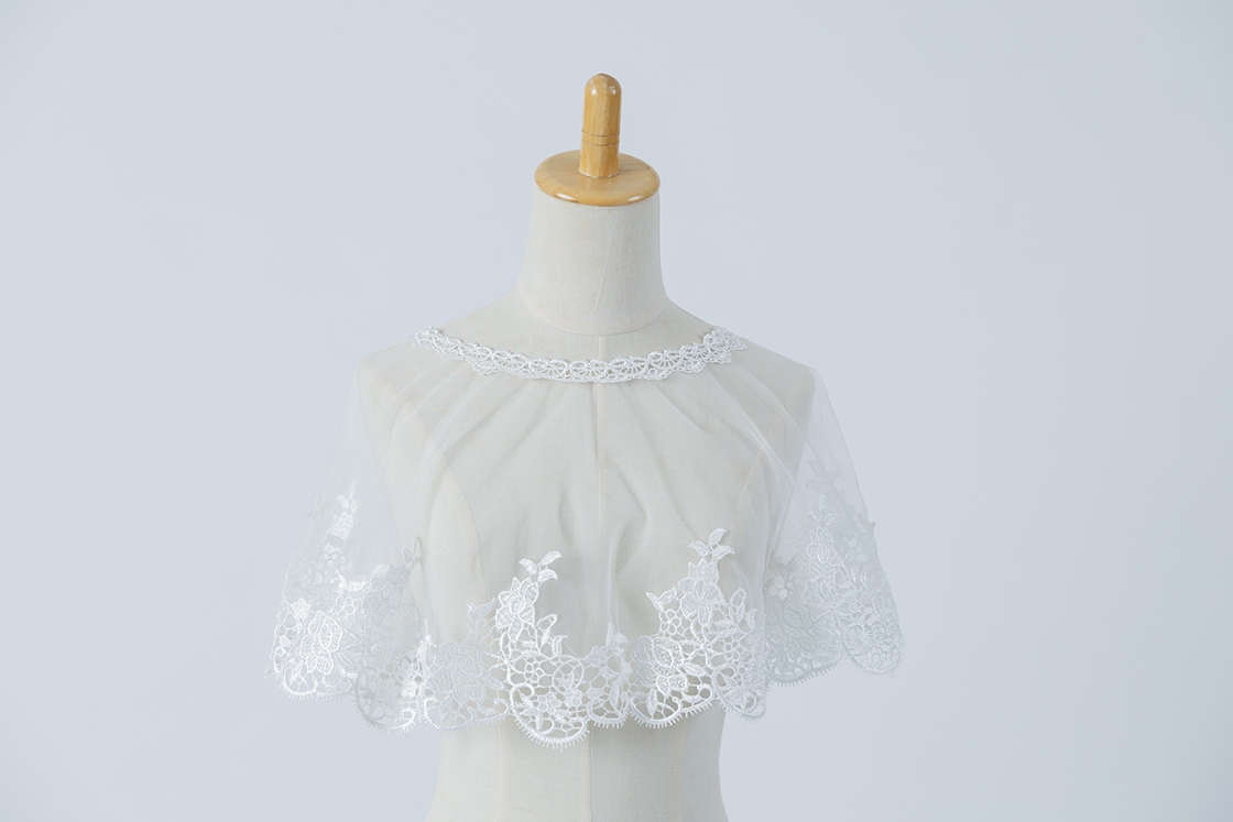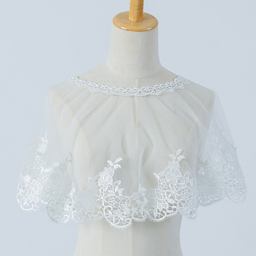 オフホワイトの花柄刺繍レースが上品で華やかな、被るタイプのボレロです。