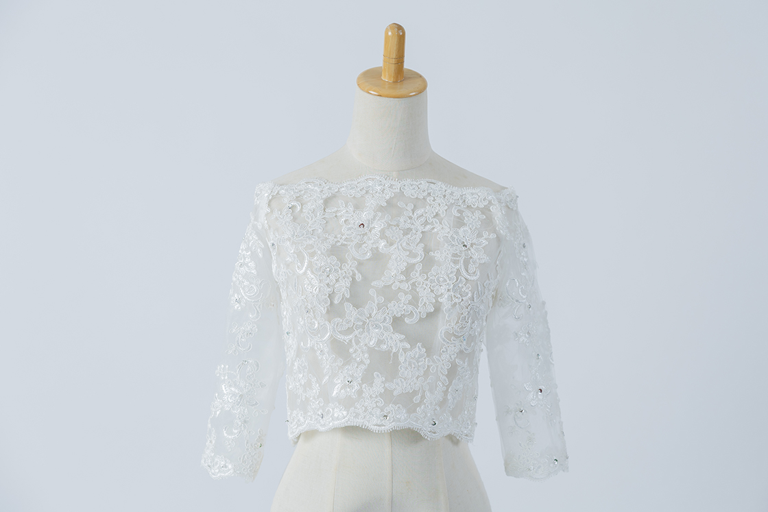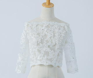 細やかなスパンコールが上品なきらめきを添える、オフショルダータイプの7分袖ボレロです。